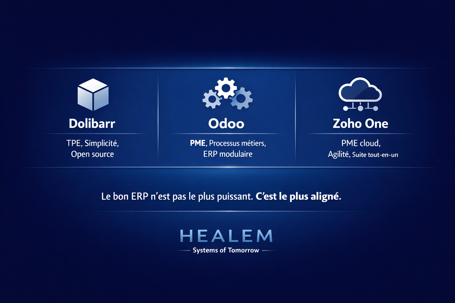 💡 Chez Healem, nous accompagnons les dirigeants dans le choix, l’intégration et l’évolution de leur ERP, avec une expertise assumée sur Odoo, Zoho One et Dolibarr, et une approche orientée système d’information durable, pas simple logiciel.